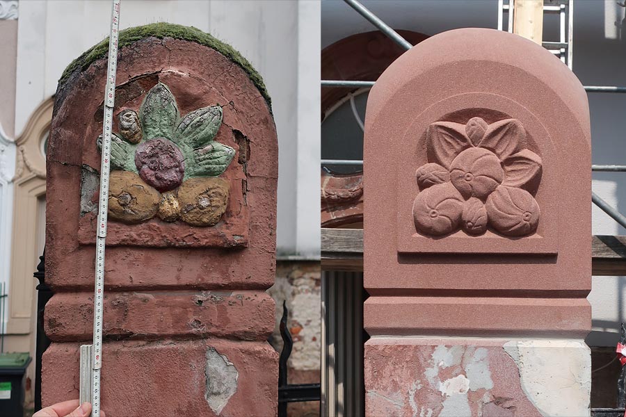 Natursteinreinigungen ohne chemische Zusätze werden bei uns unter anderem im Nass-, Feucht- und Trockenstrahlverfahren je nach Vorgabe des Kunden und des gewünschten Reinigungserfolges durchgeführt. Für feine und filigrane Arbeiten, z.B. im figürlichen Bereich, kommt ein Mikrostrahl- oder Heißdampfgerät zum Einsatz.